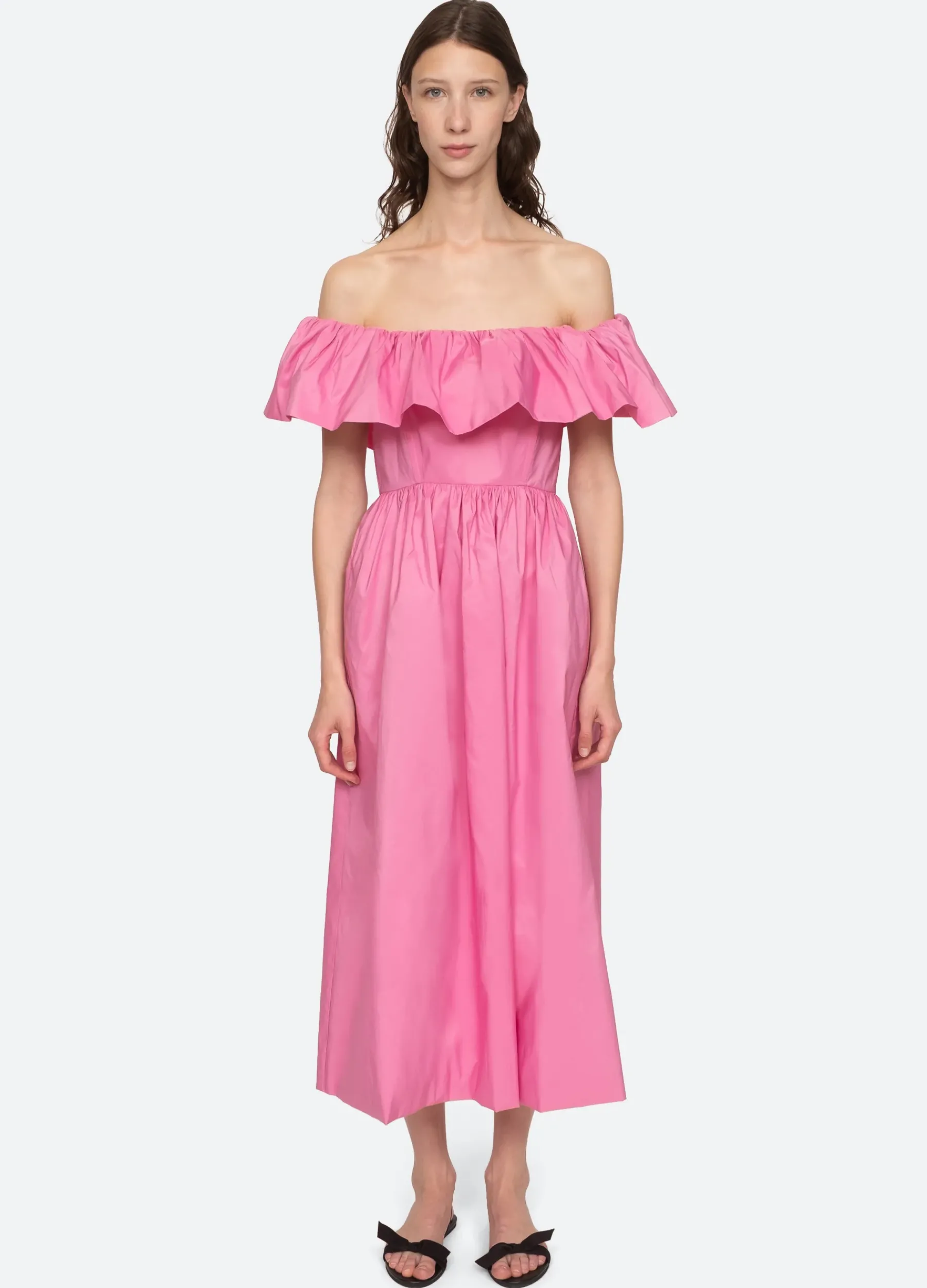 The Diana taffeta off the shoulder dress features an oversized off the shoulder ruffle and full skirt.