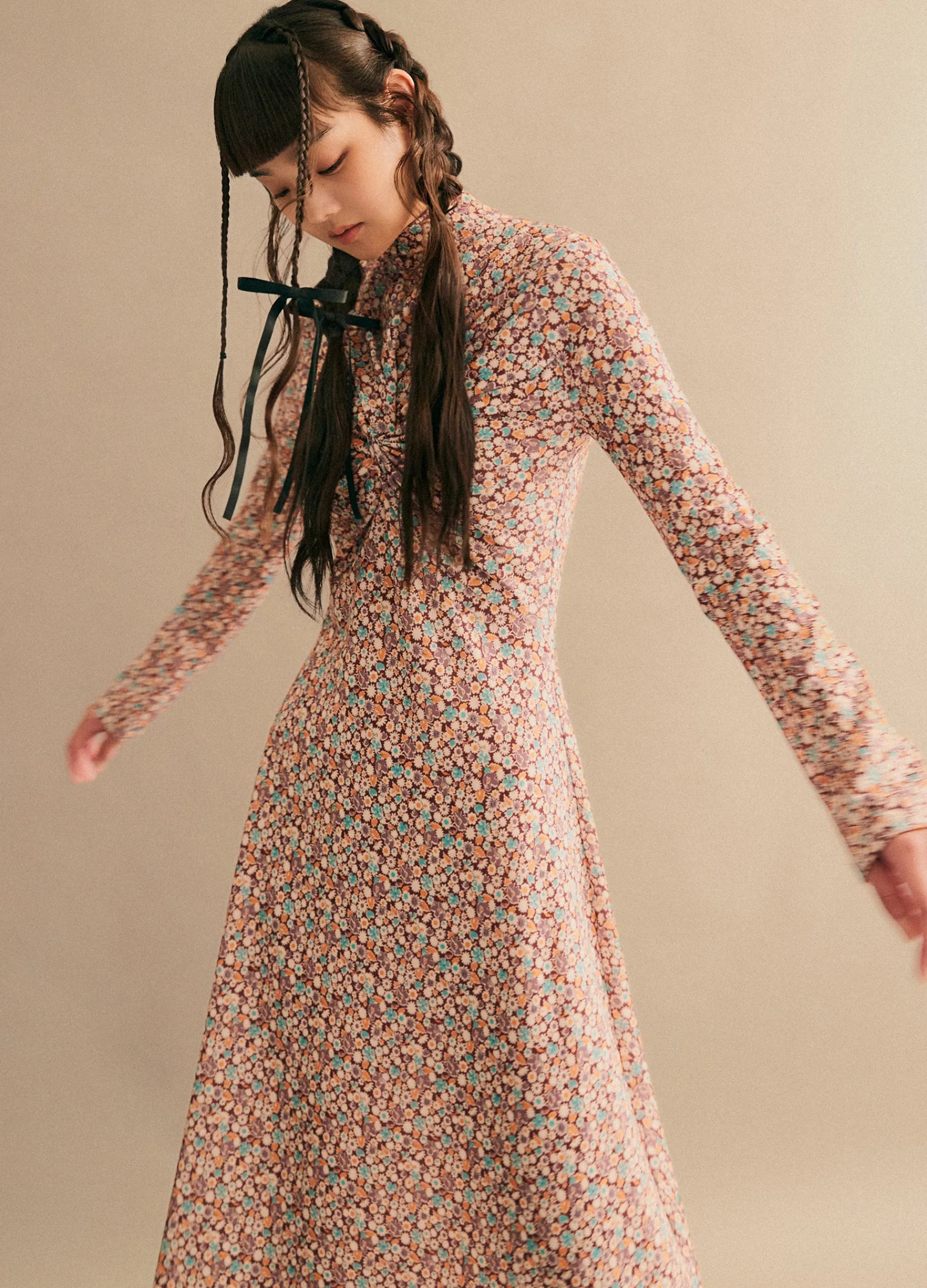 The Fernande floral print long sleeve dress features a midi silhouette with ruched detailing on the bodice.