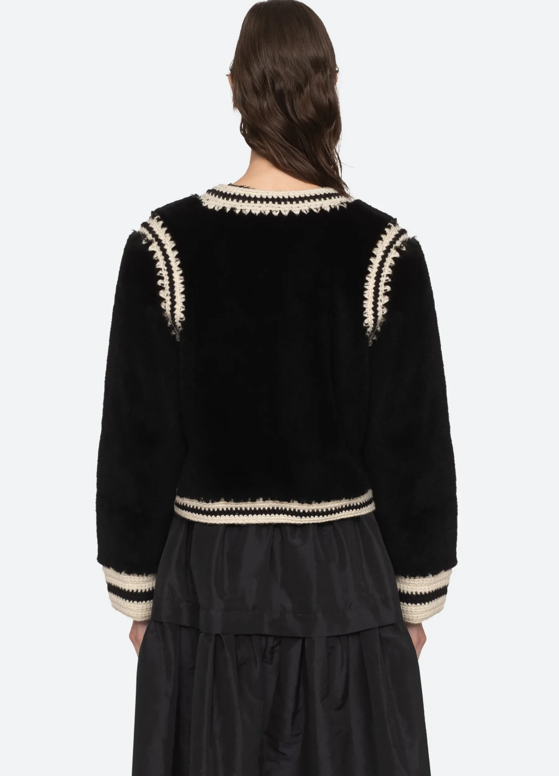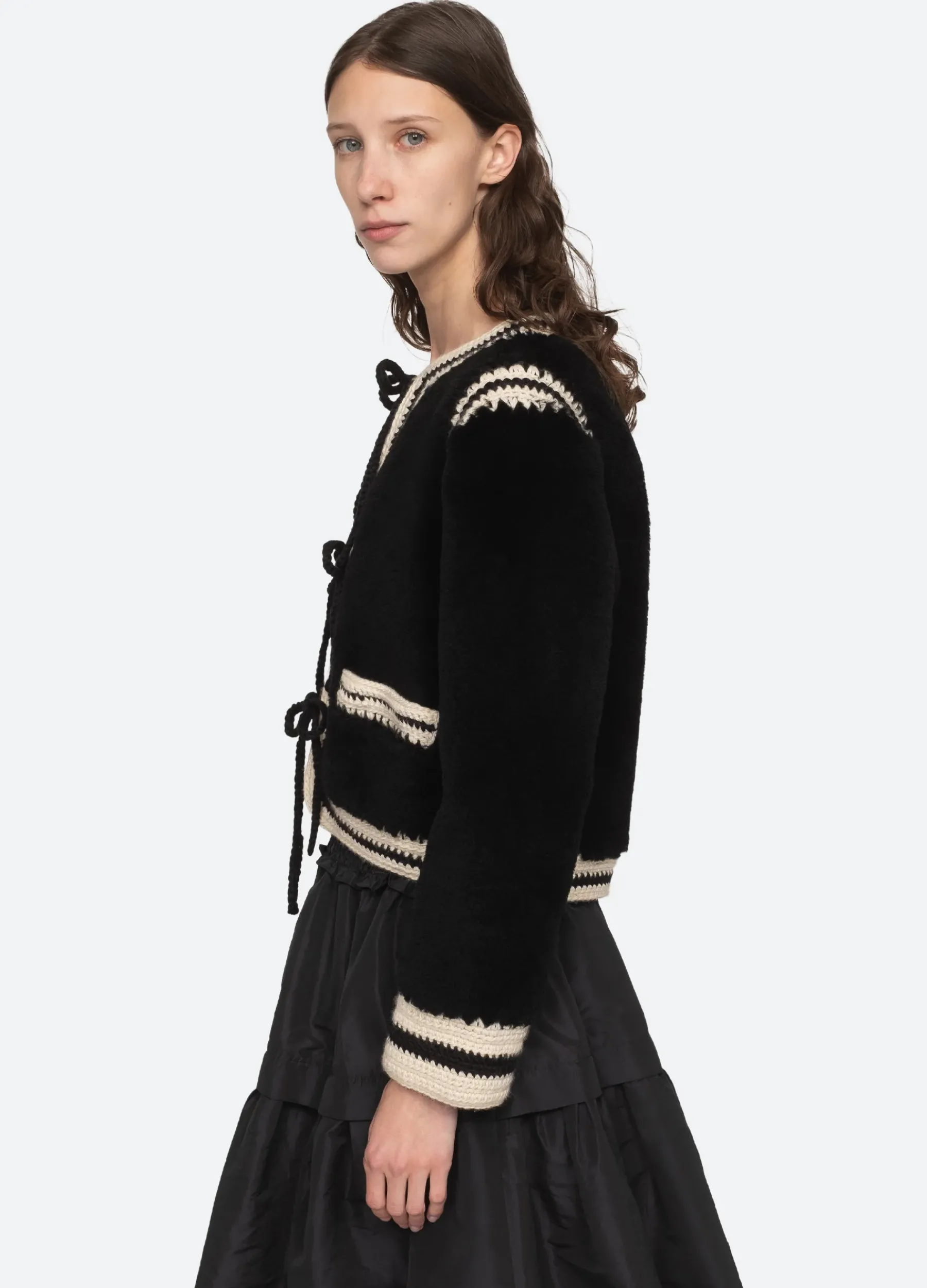 The Harper faux fur jacket features crochet trim detailing and tie front closures.
