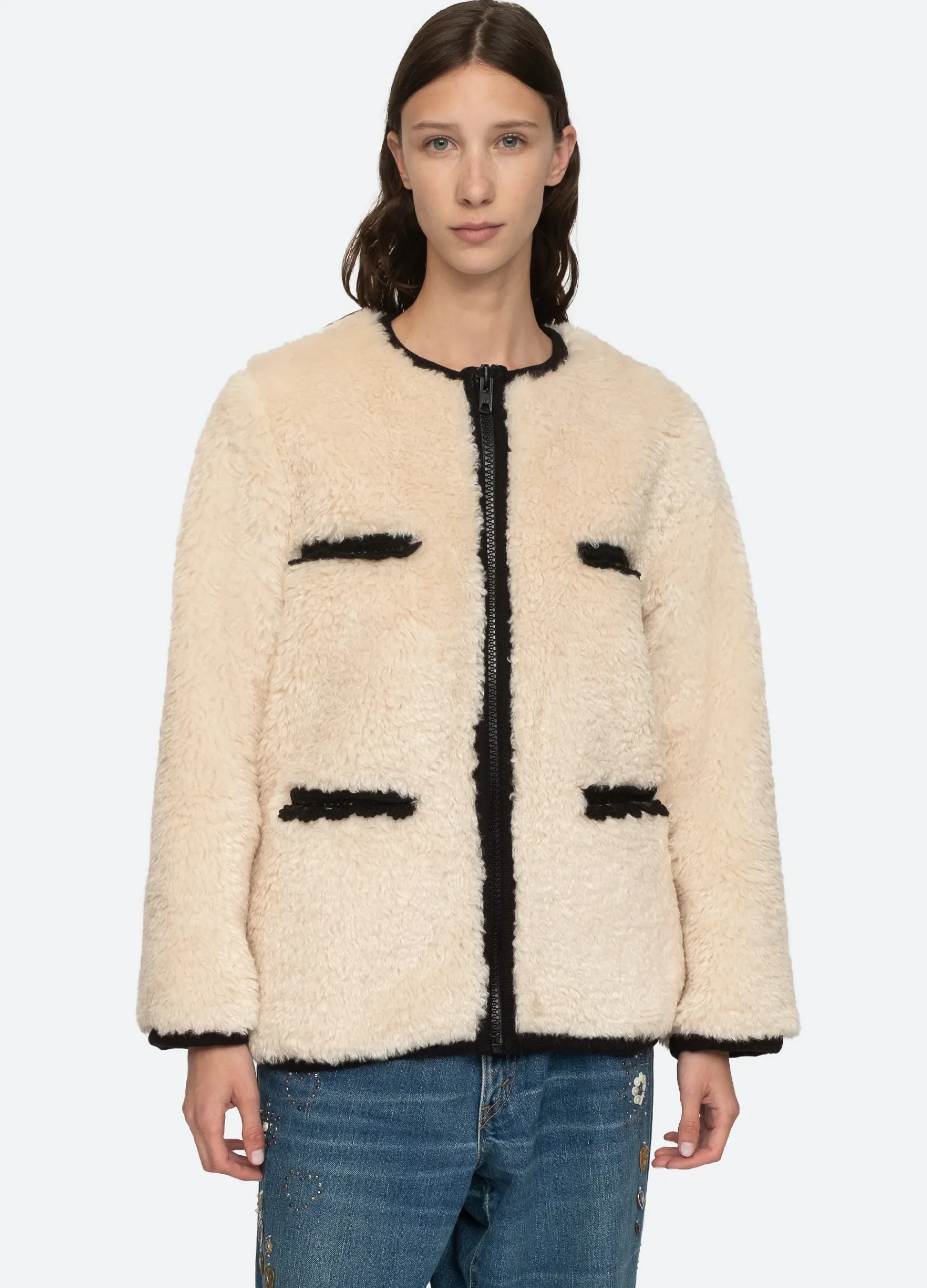 The Harper faux fur parker jacket features crochet detailing and exposed front zipper.