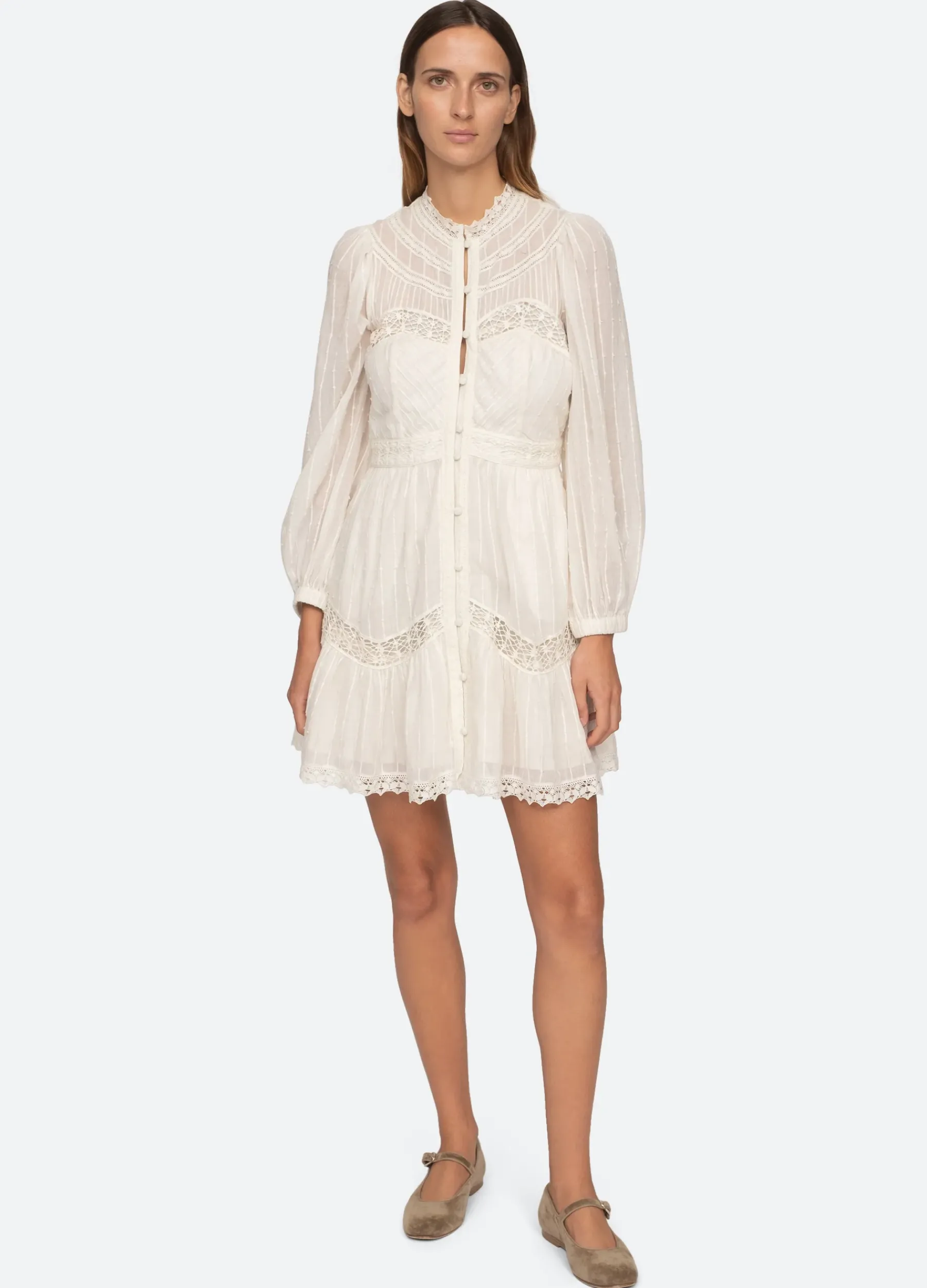 The Haven cotton dobby pintuncked dress features long puff sleeves, lace insets and trim detailing.