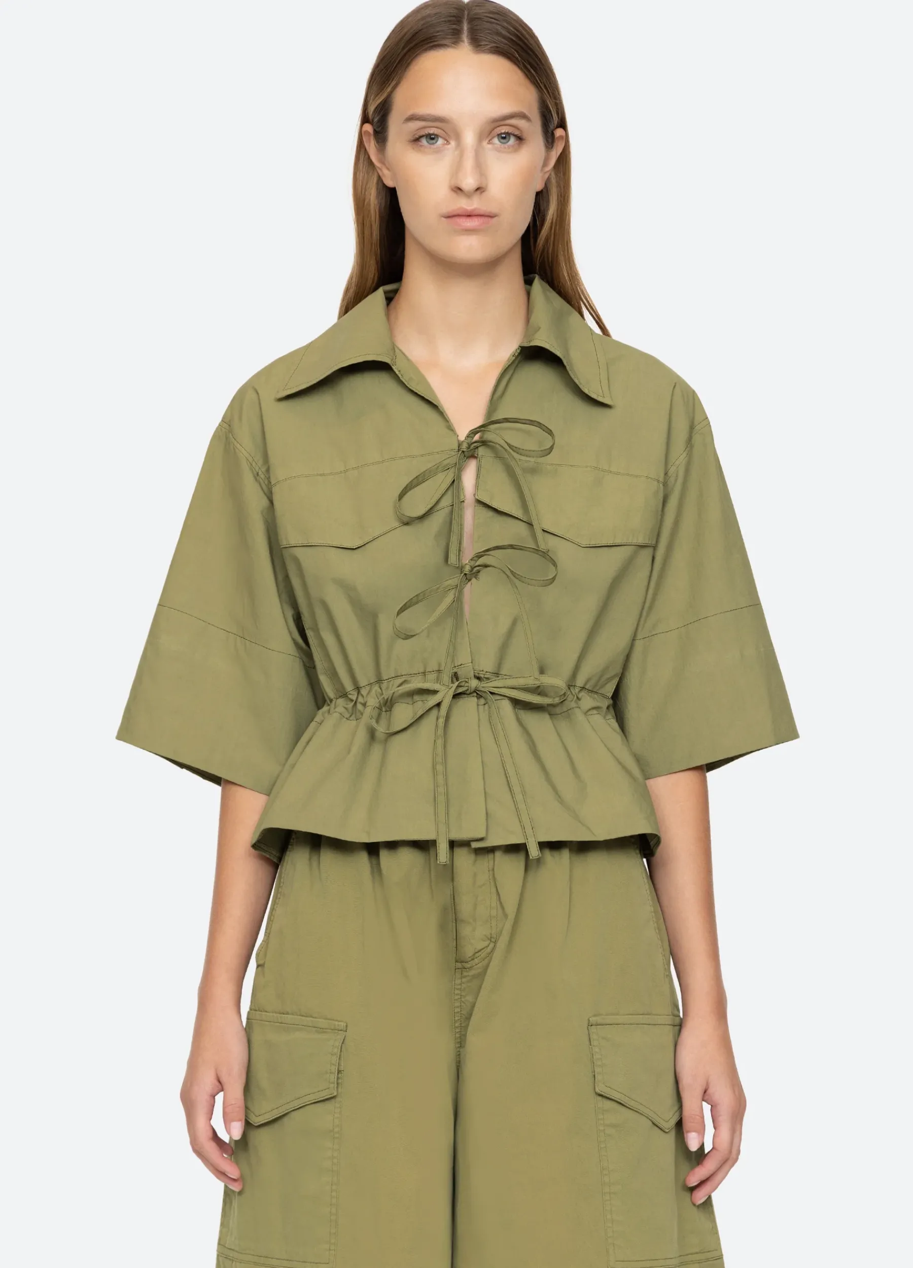 The Karina tie front top features voluminous sleeves, elasticized waist and front tie closures.