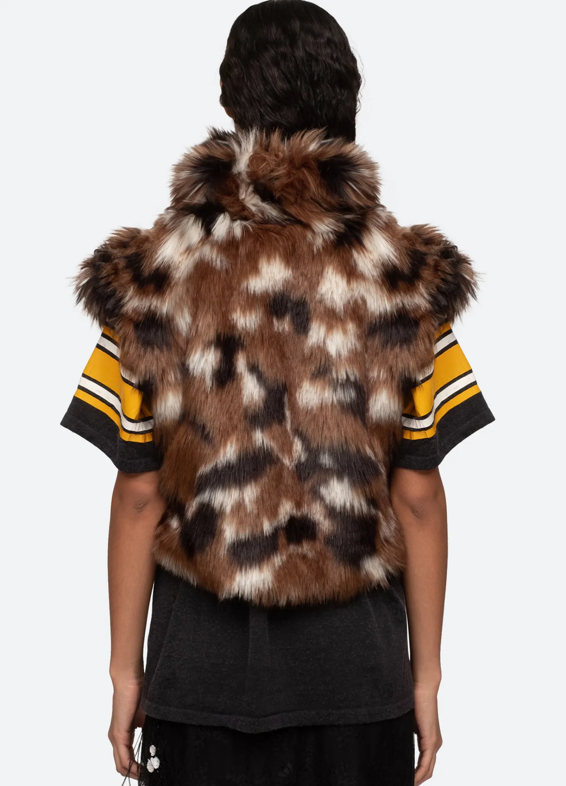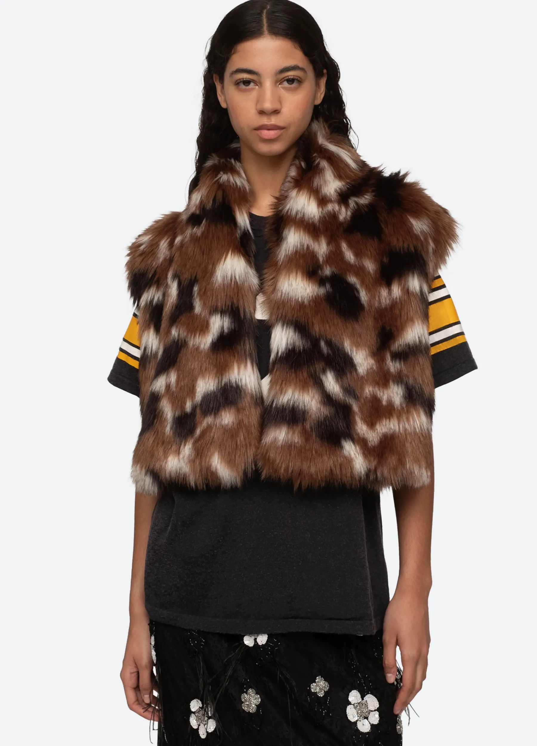 The Karlie faux fur vest features a cropped silhouette and multi colored faux fur.