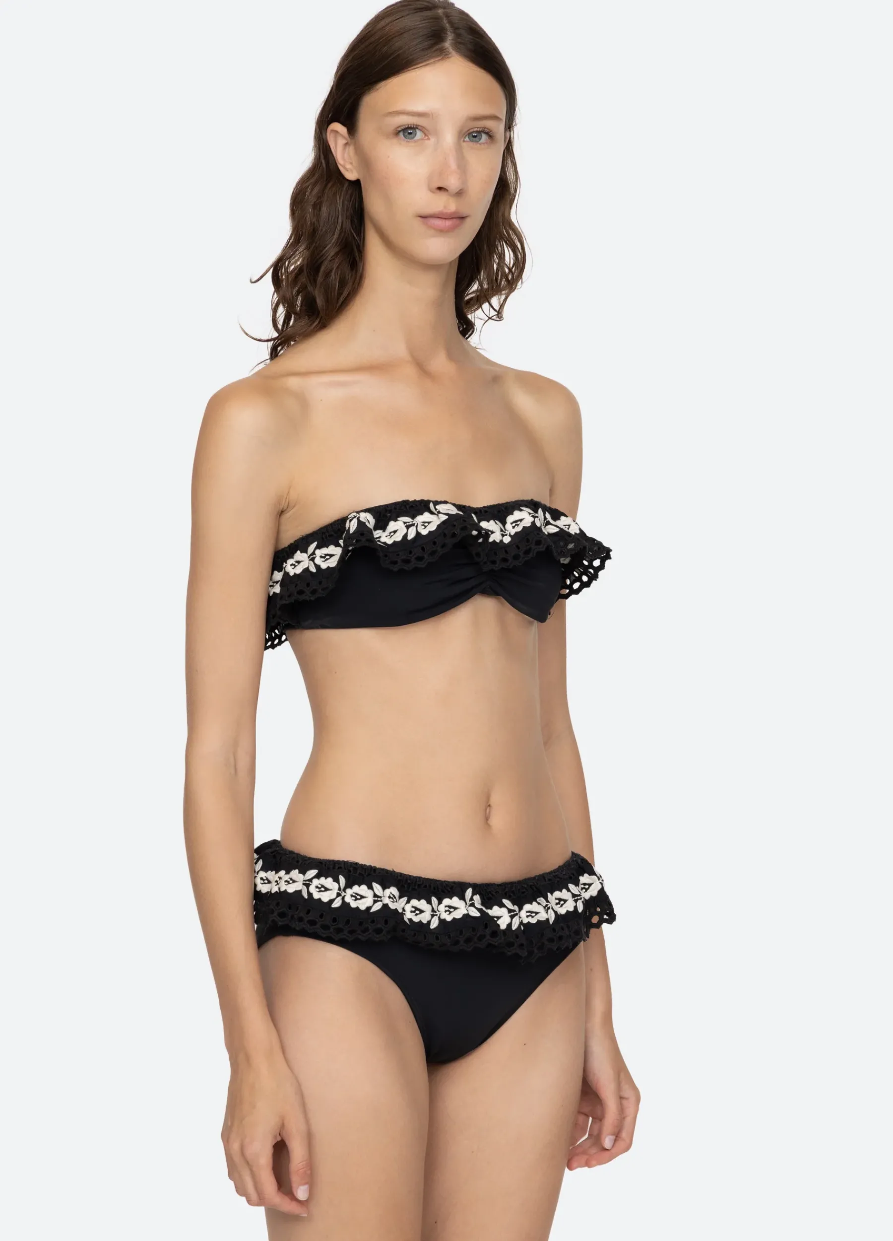 The Kayta embroidered ruffled bandeau features a ruffle tier and floral embroidered trim.