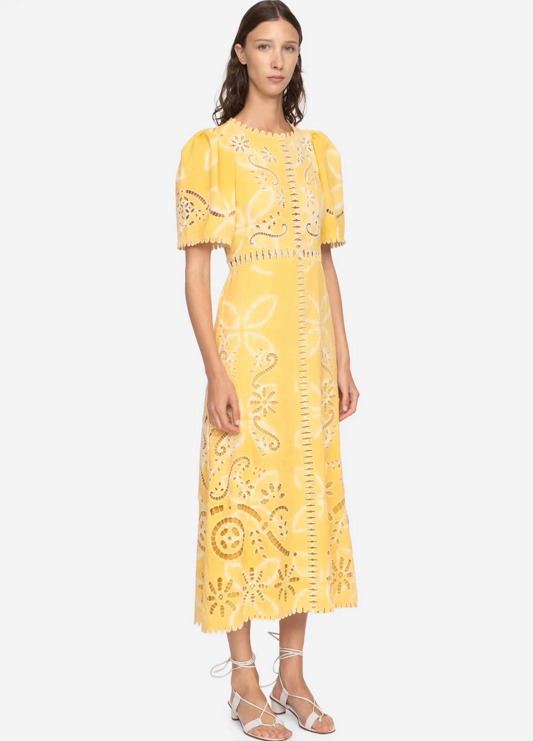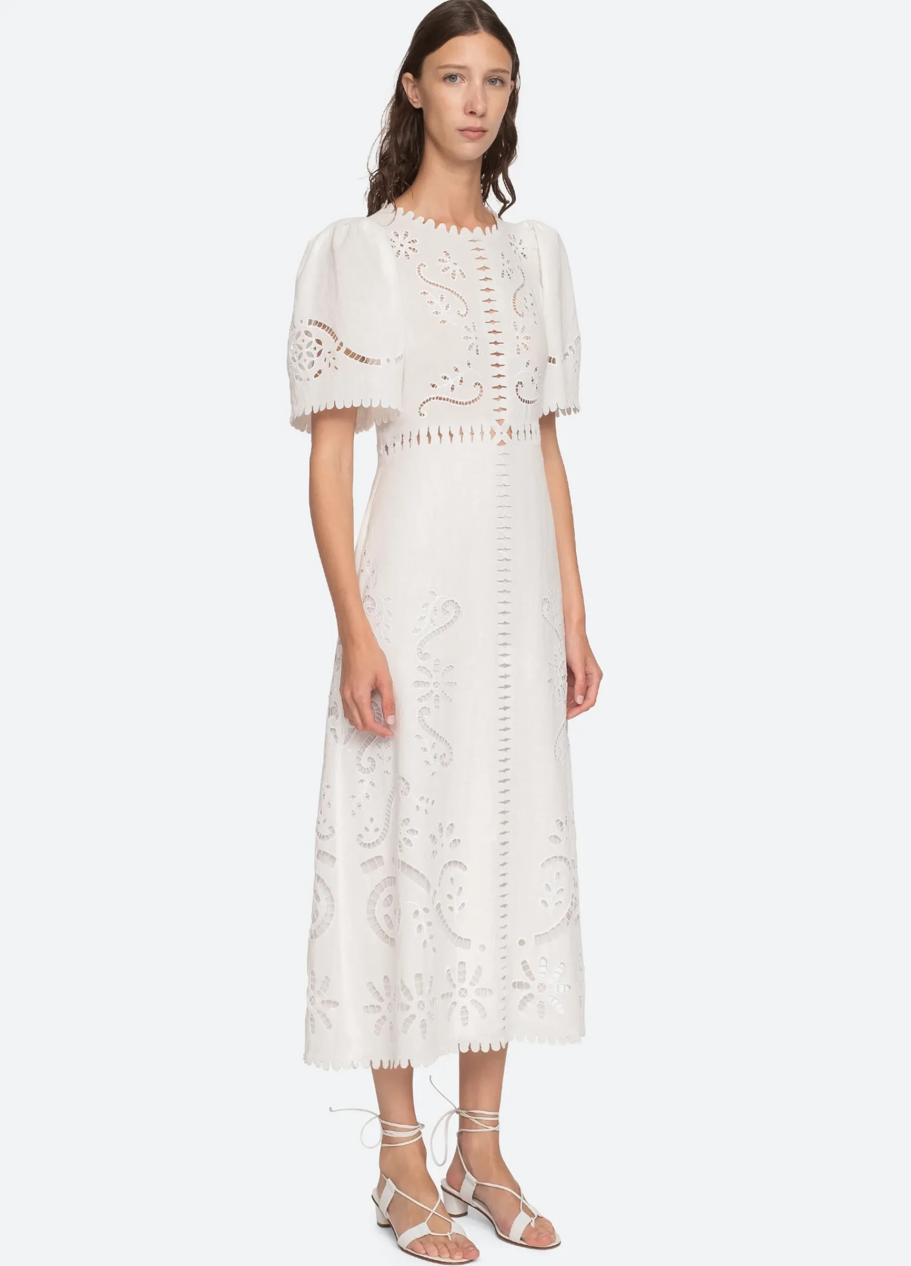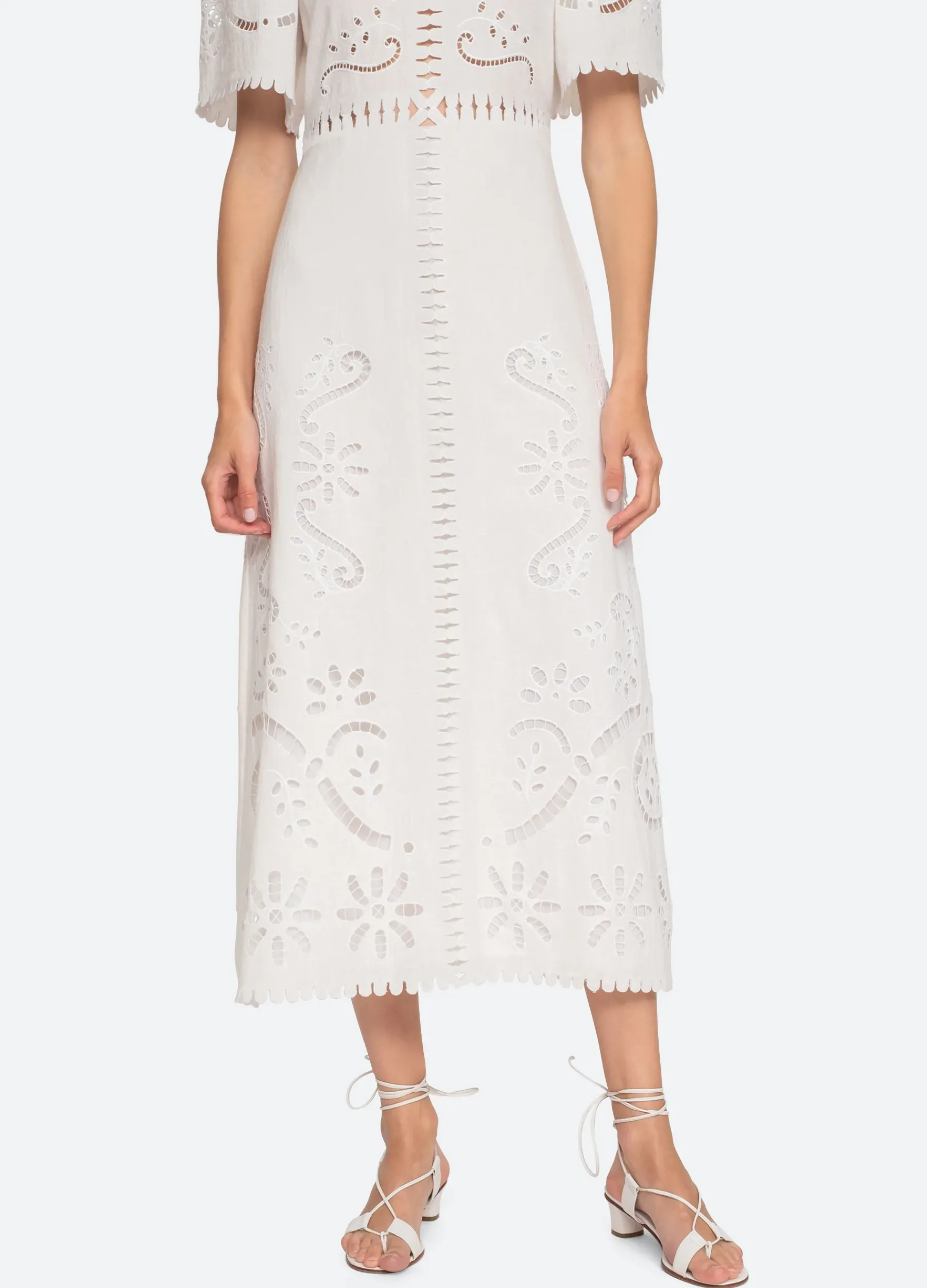 The Liat short sleeve embroidered dress features eyelet floral detailing, cutout accents and scalloped trim detailing.