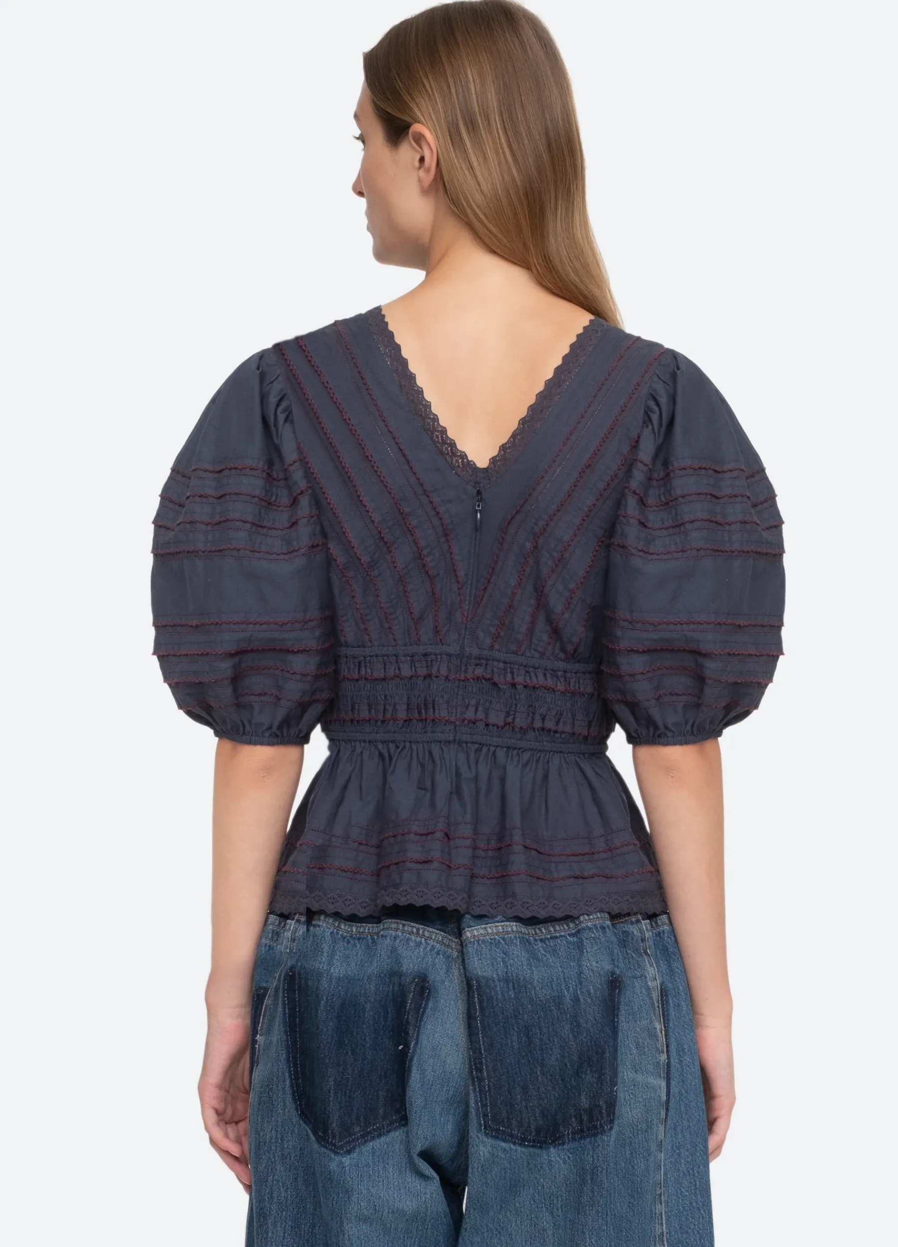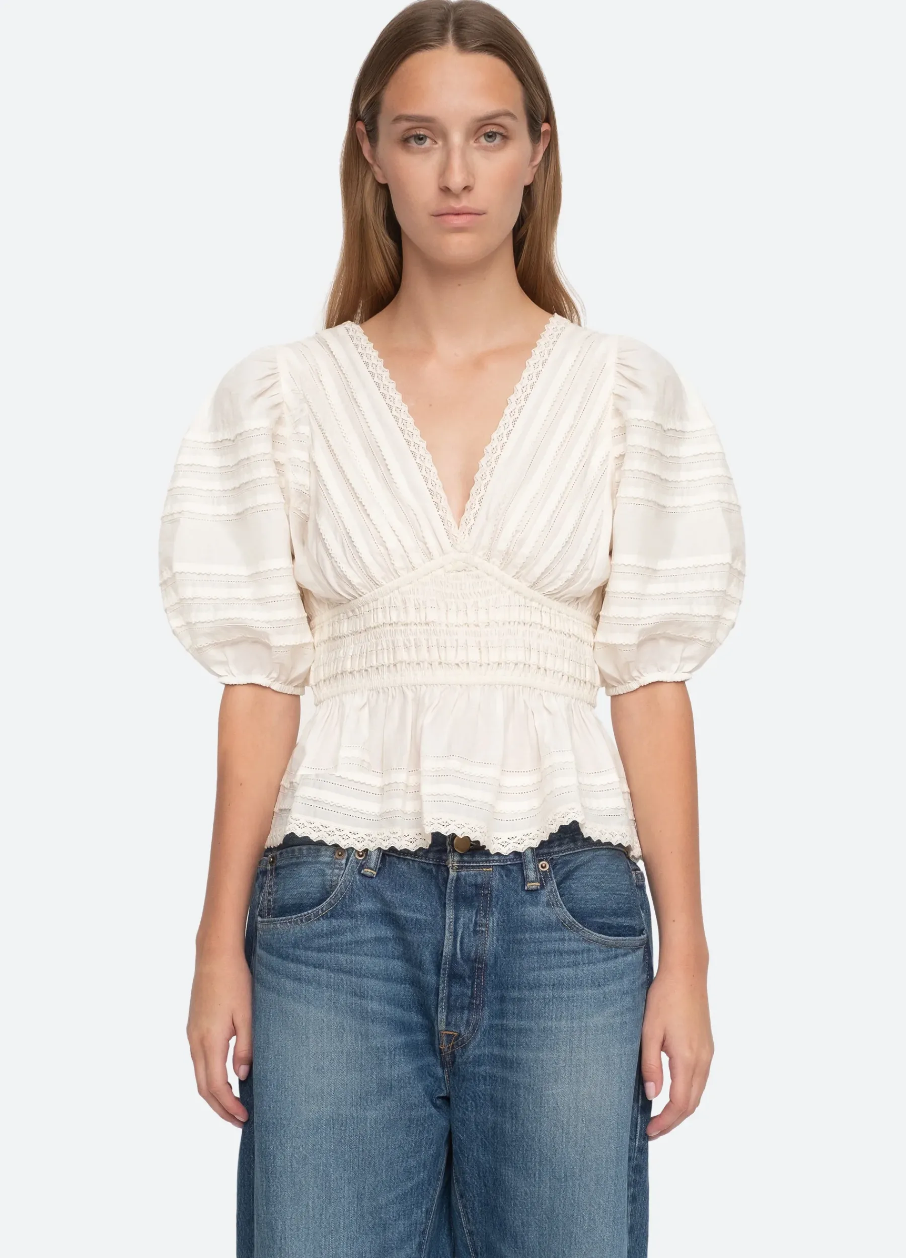 The Mable top features puff sleeves, v-neckline, pleated detailing and lace trim.