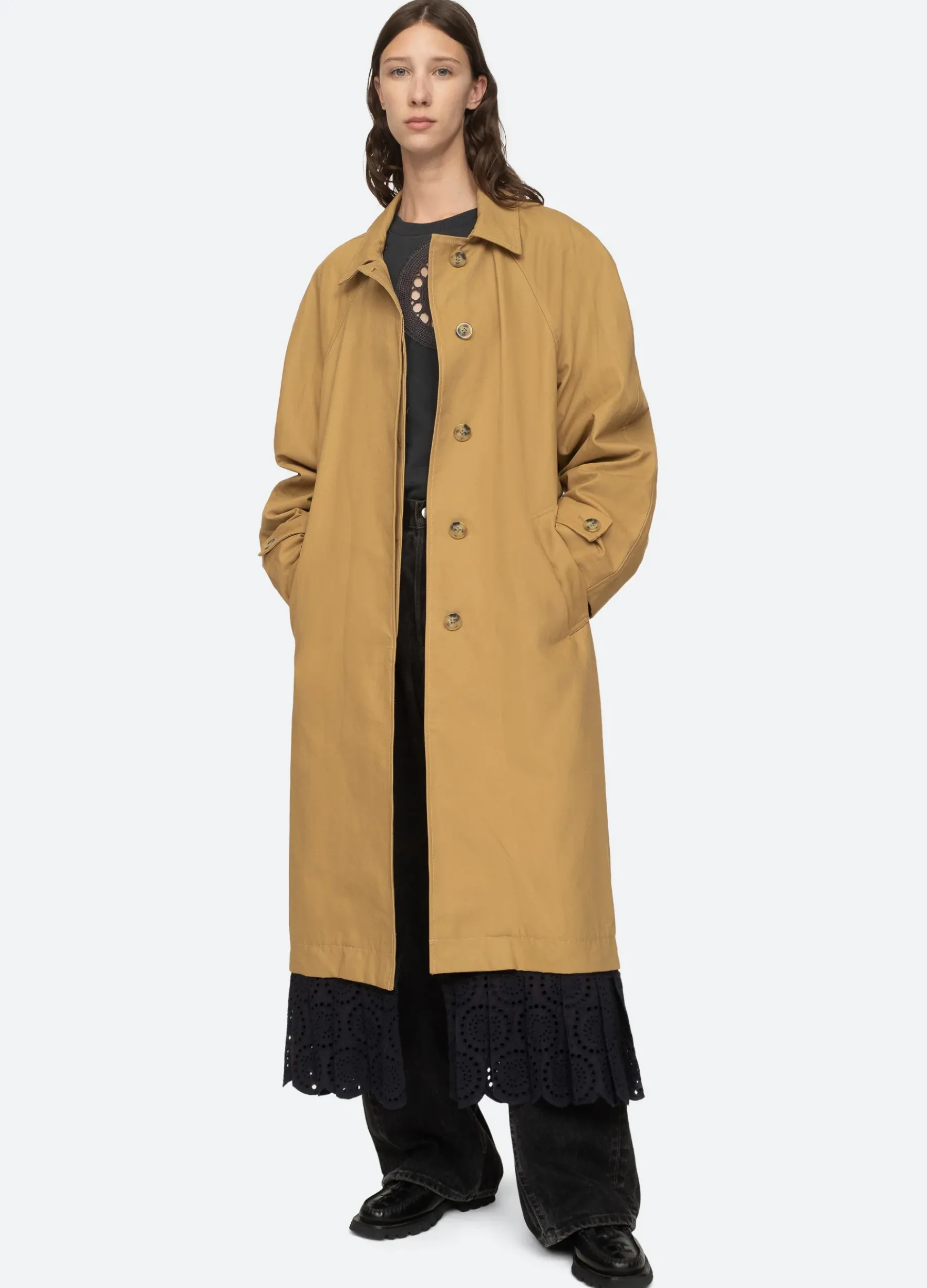 The Maeve eyelet trench coat features a self tie belt and eyelet hemline.