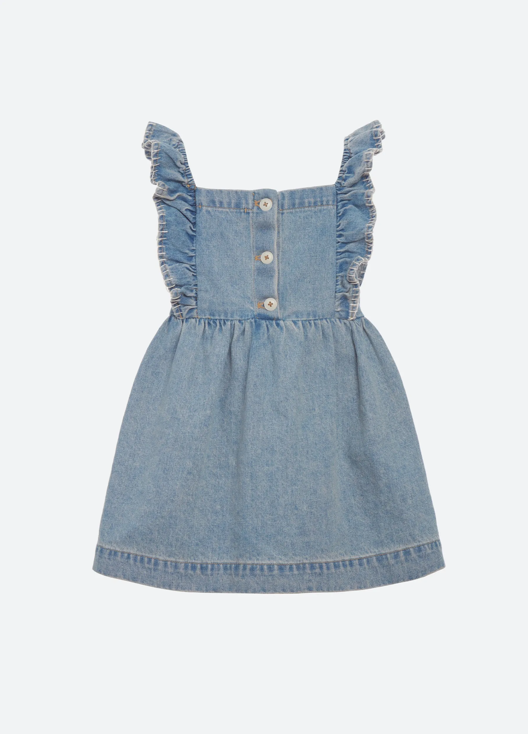 The Marion mended denim kids dress features flutter sleeves and embroidered “Sea” logo. Part of our mommy & me coordinating collection.