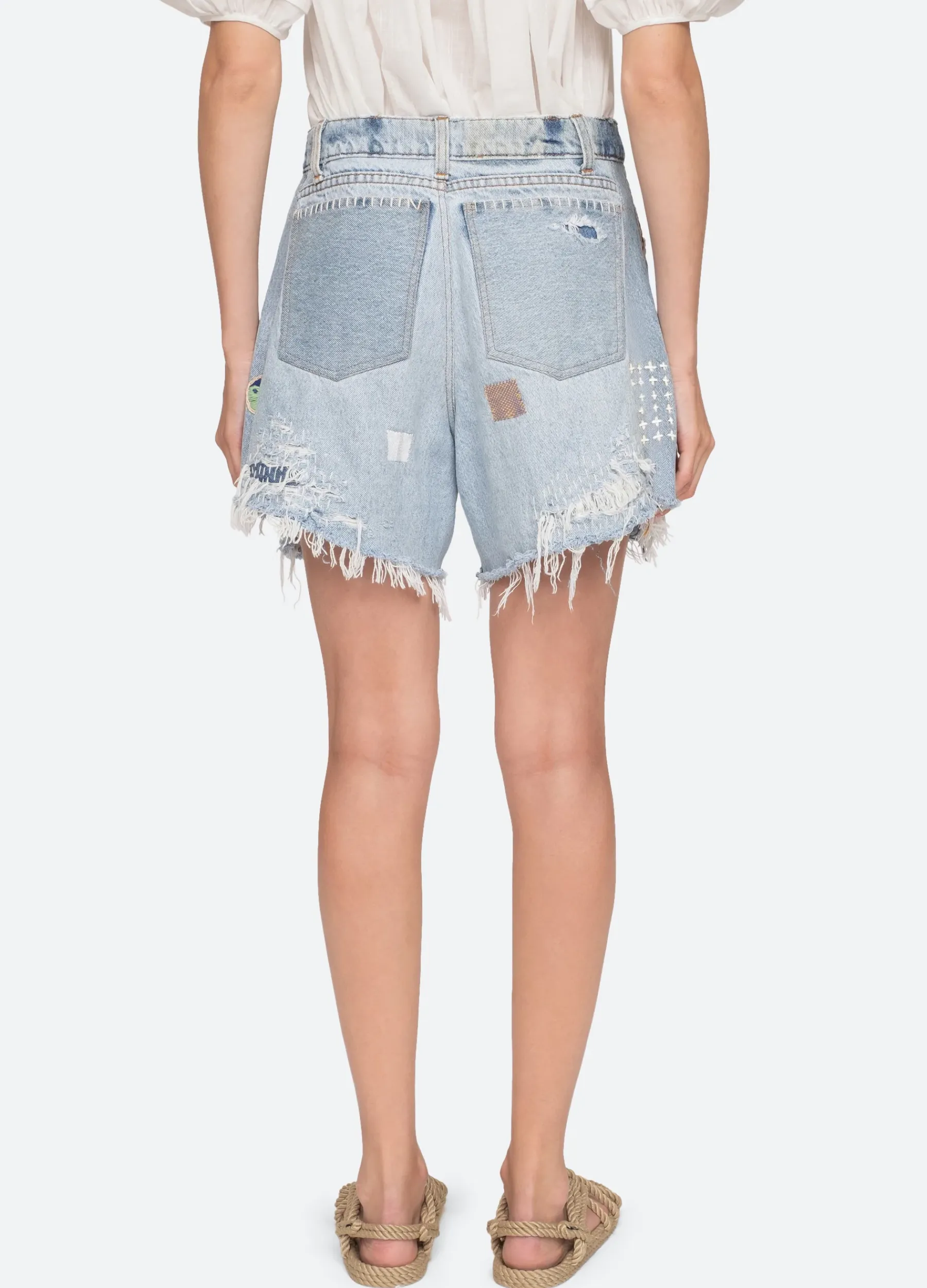 The Marion mended denim shorts feature a frayed hemline and embroidered detailing throughout.