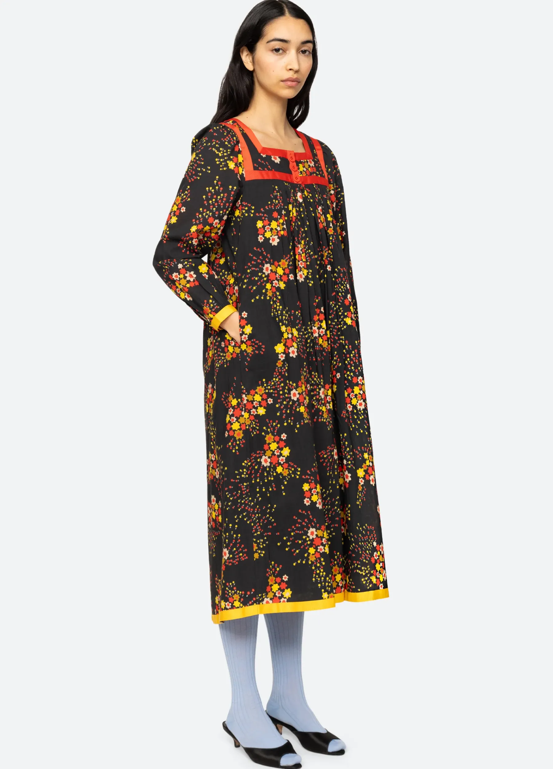 The Paloma Vintage x Sea collection was born from Monica and Ferial’s shared passion for vintage. Monica discovered Paloma Vintage on a trip to Copenhagen and immediately was drawn to the shop’s unique curation of vintage treasures. Over the years, Monica forged a friendship with Ferial which led to designing a capsule collection together inspired by Ferial’s vintage finds and unique styling sensibility. The Paloma flora dress features a square neckline, long sleeves and solid trim detailing. Designed for an oversized fit.