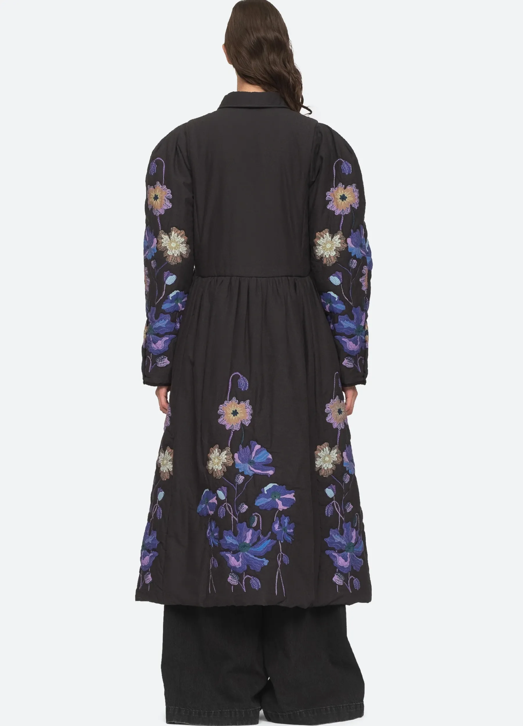 The Paula floral patchwork print coat features colorful florals throughout.