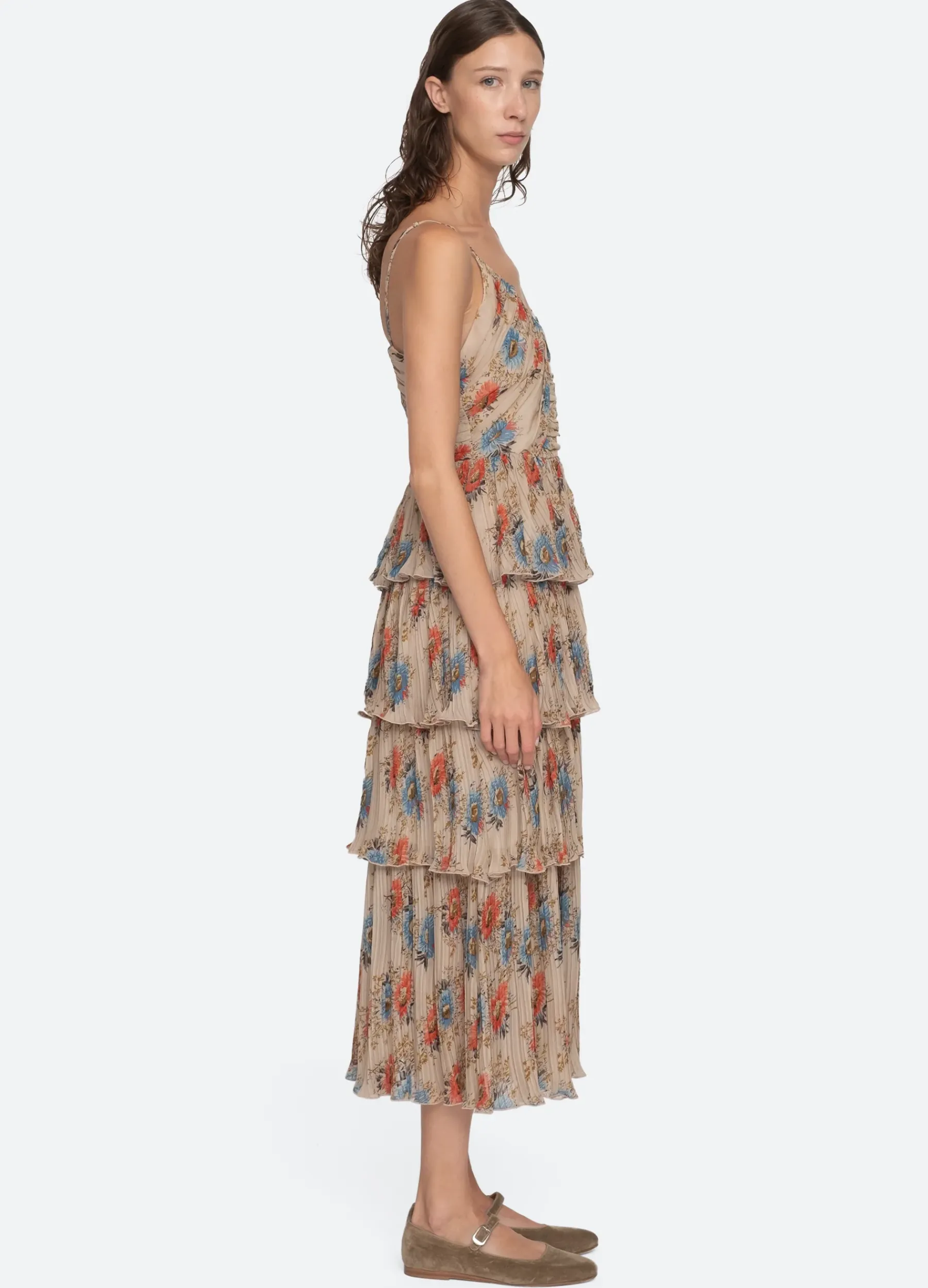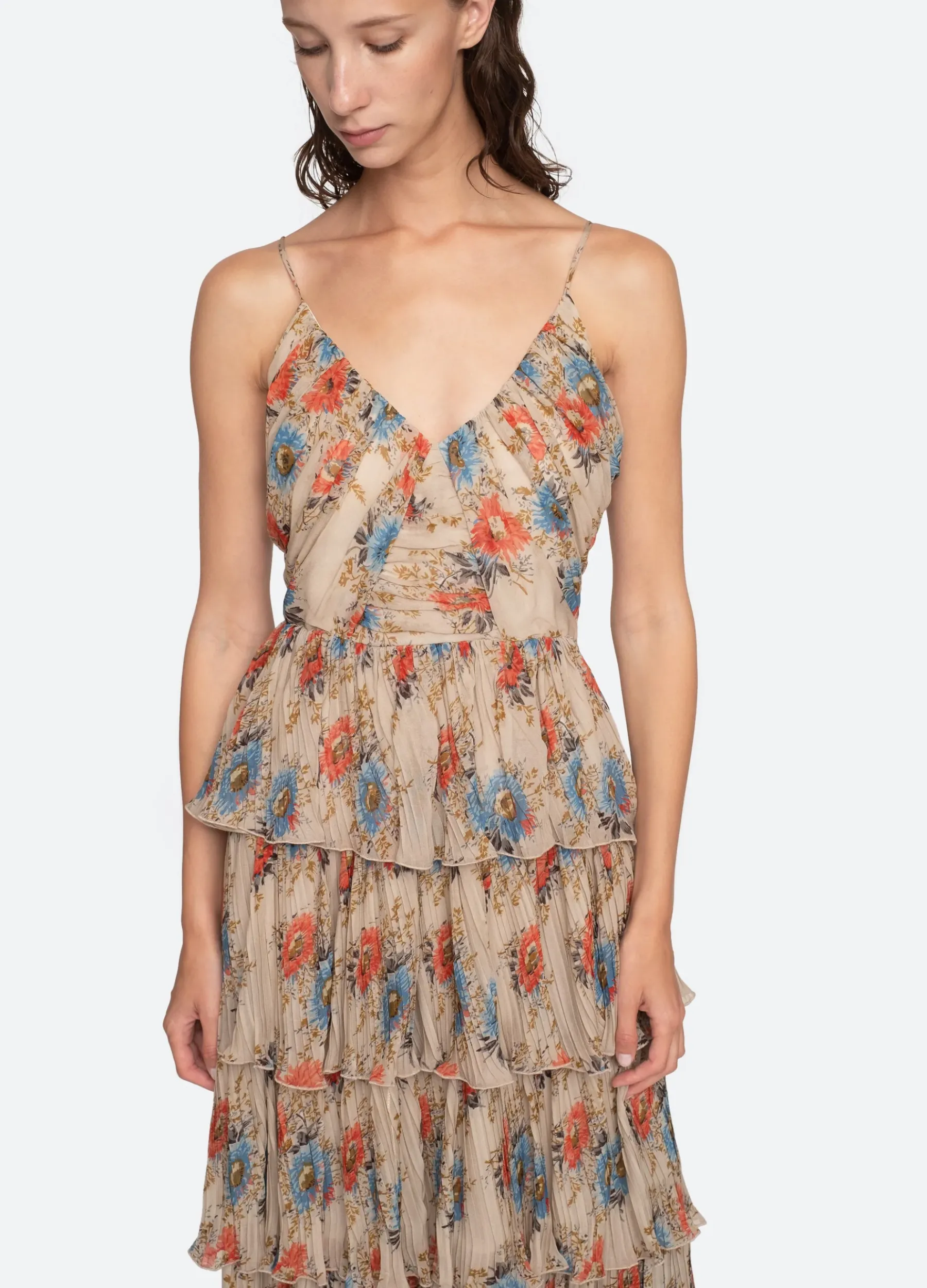 The Roanne floral print tiered dress features a ruched bodice, smocked back and tiered skirt.