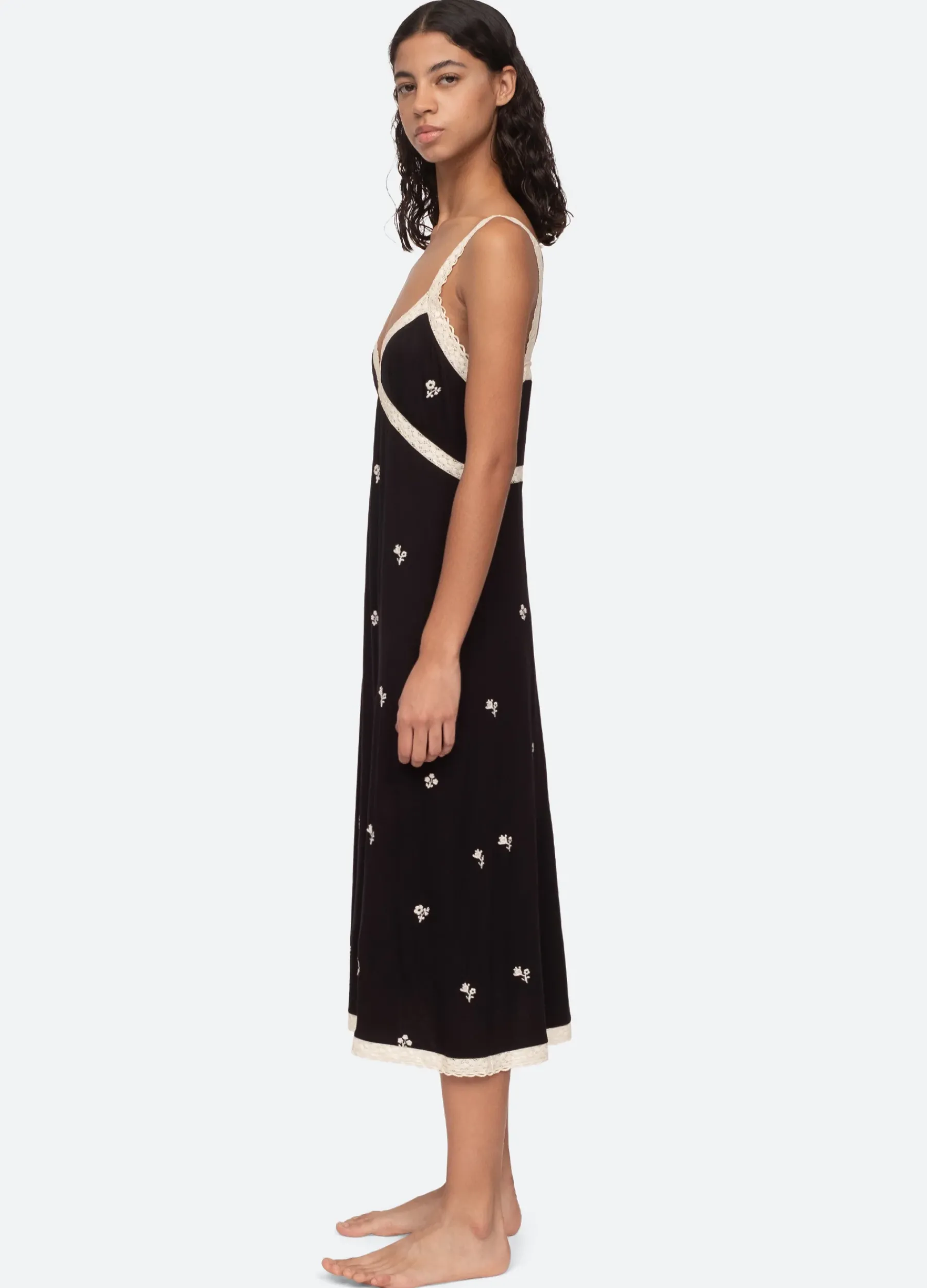 The Rubina embroidery pajama slip dress features floral embroidery and lace detailing.