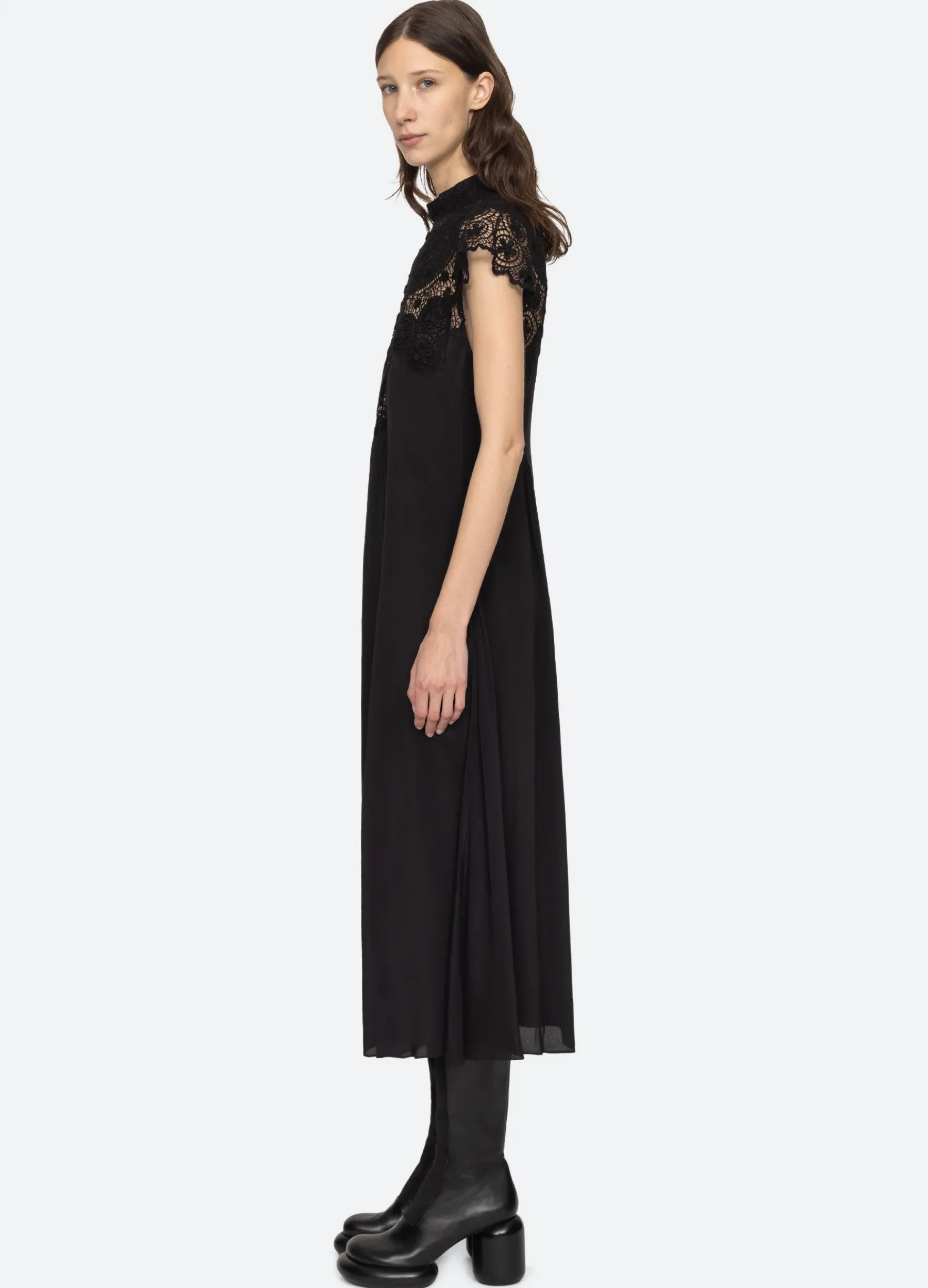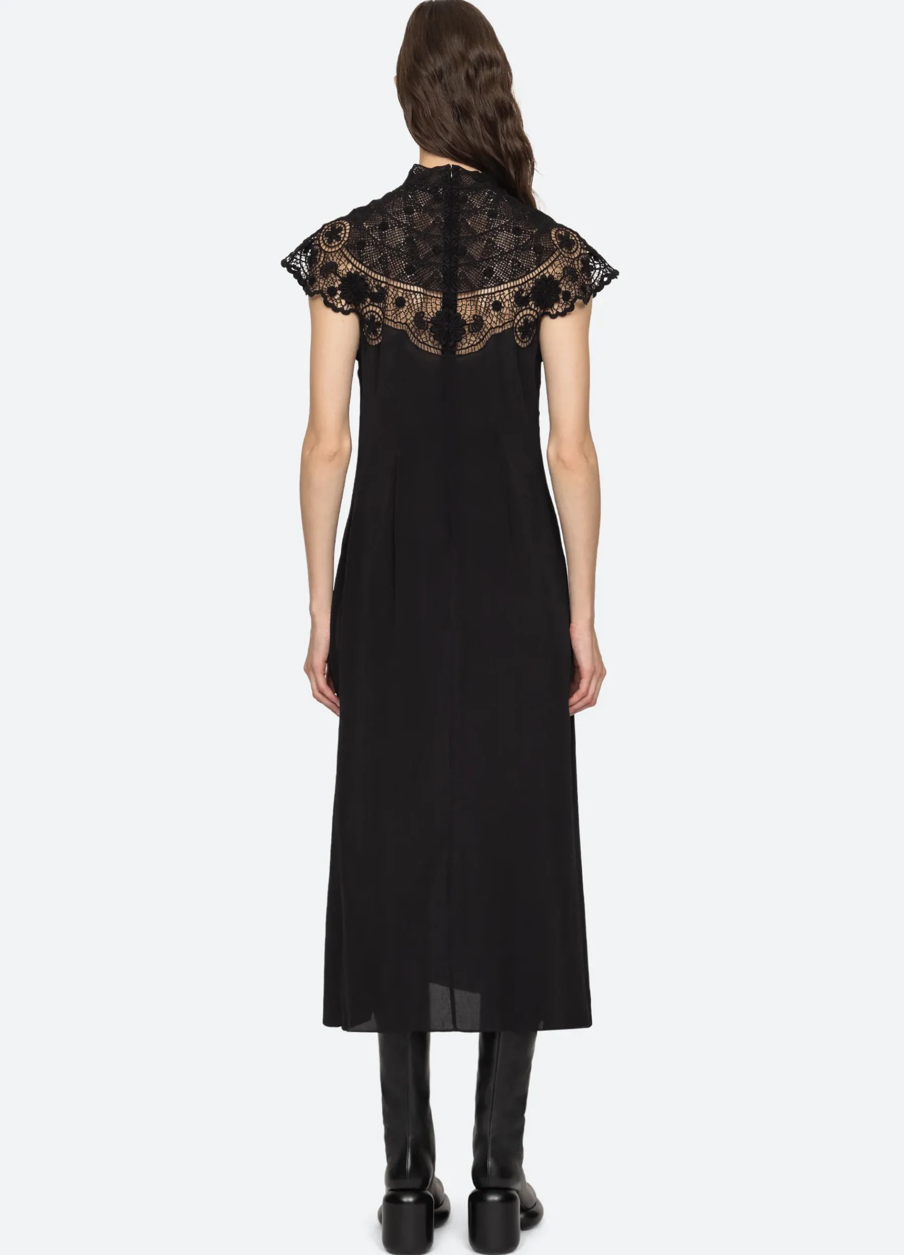 The Serita dress features intricate crochet lace detailing around the neckline and flutter sleeves.