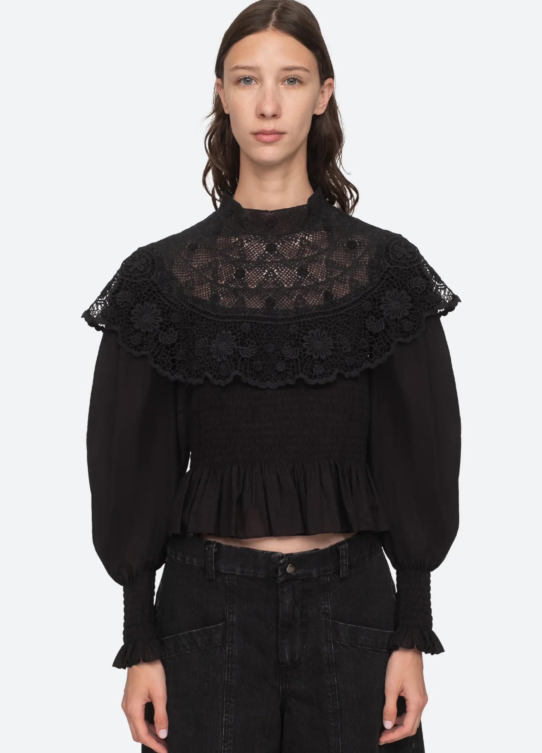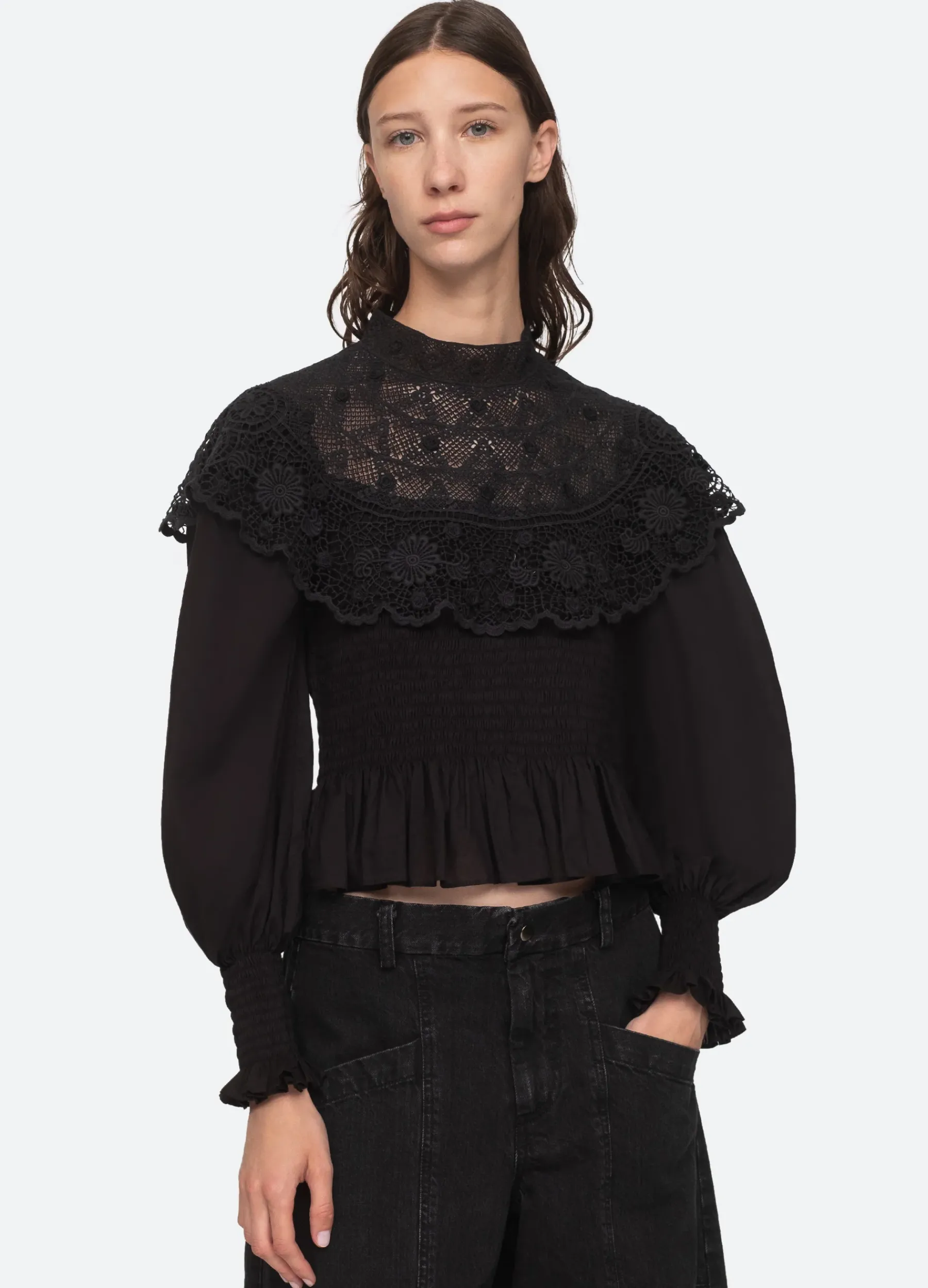 The Serita long sleeve top features a delicate crochet lace cape, smocked detailing and ruffle hemline.