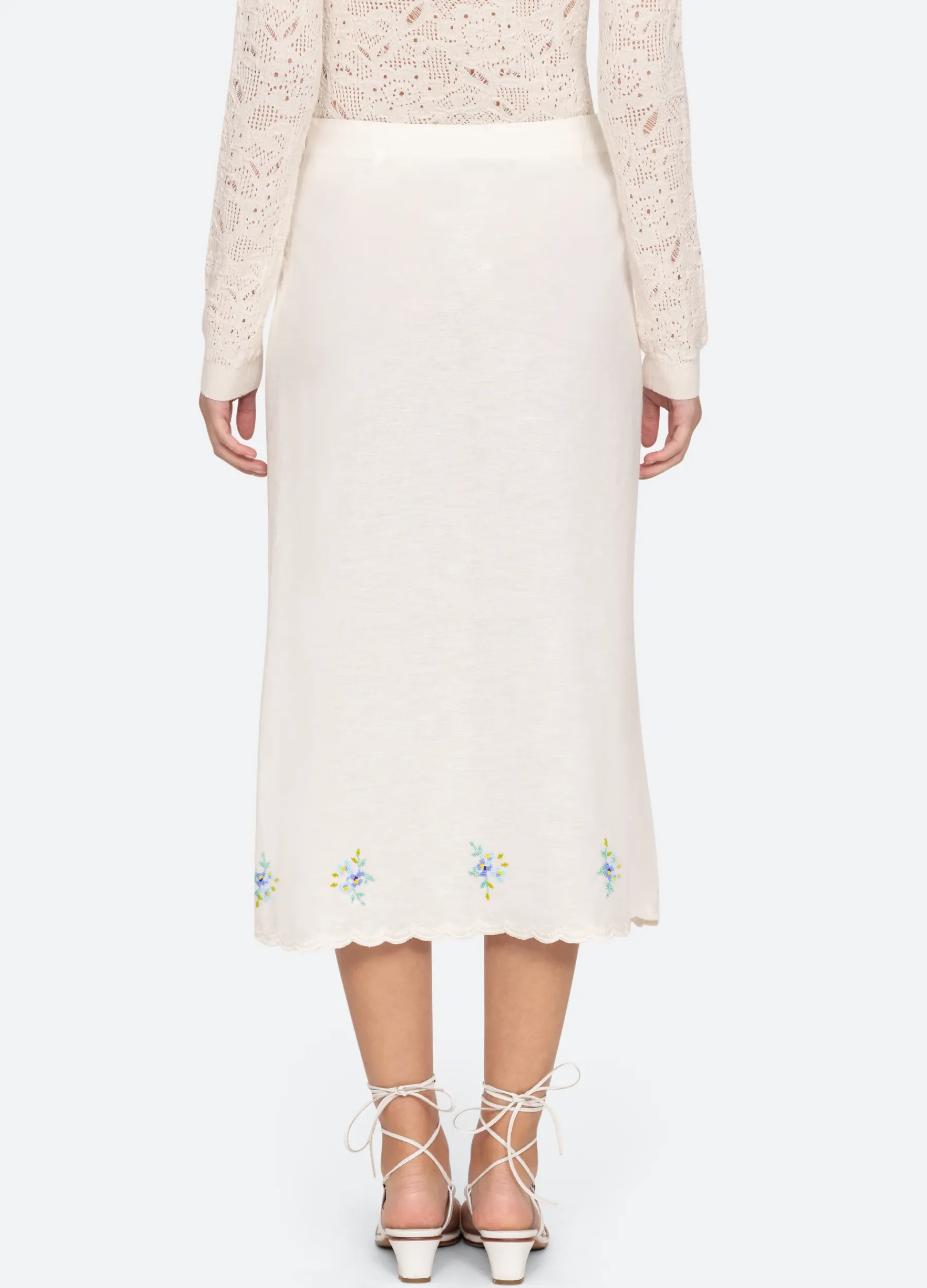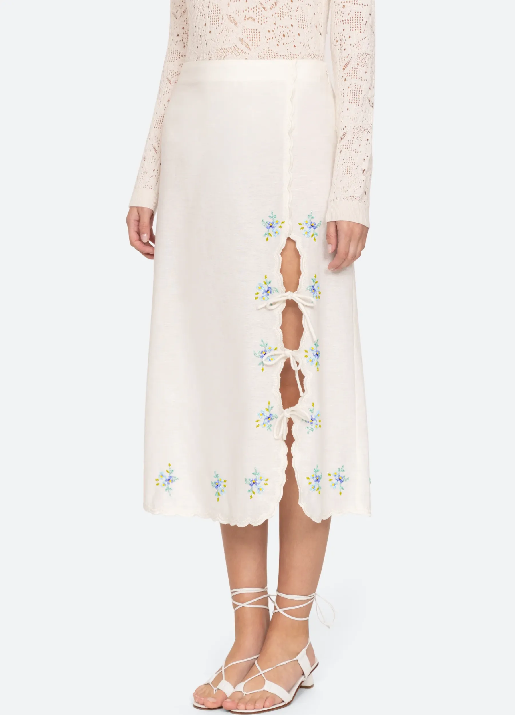 The Tania beaded skirt features an asymmetrical front slit with self ties, floral beaded detailing and scalloped hemline.