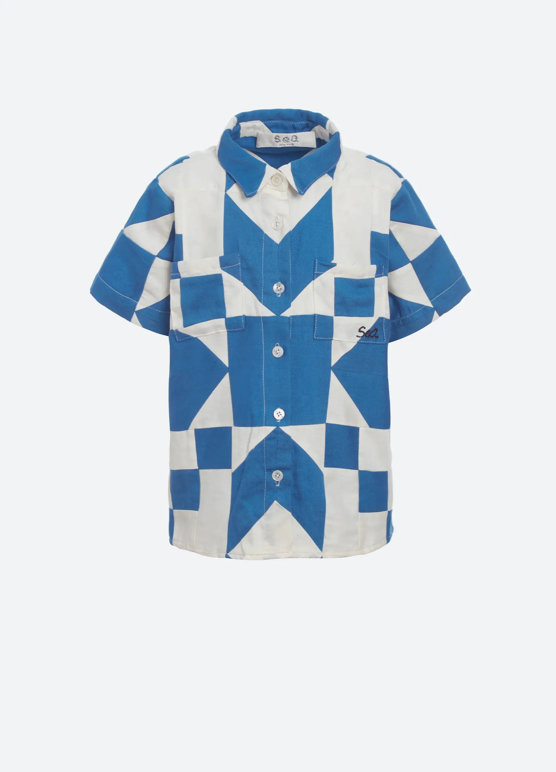 The Tanya patchwork kids shirt features an embroidered “Sea” logo and multi colored geometric patchwork print. Part of our mommy & me coordinating collection.