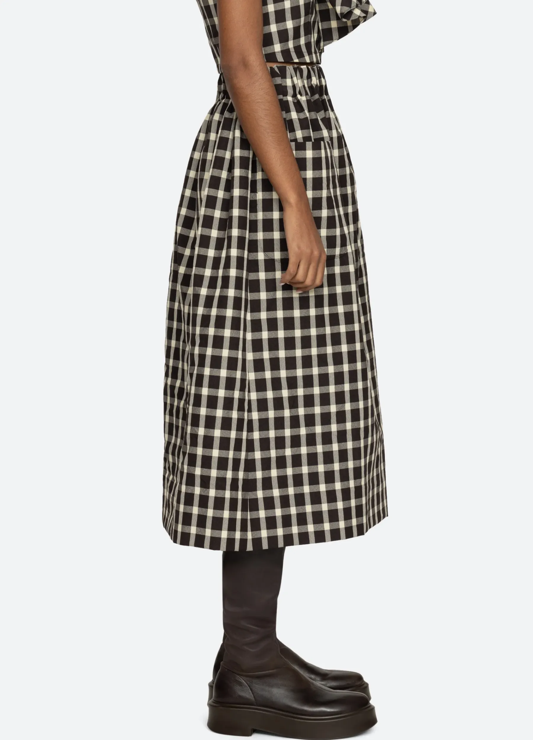 The Valeria check print skirt features an elasticated waist, A-line silhouette and oversized front pockets.