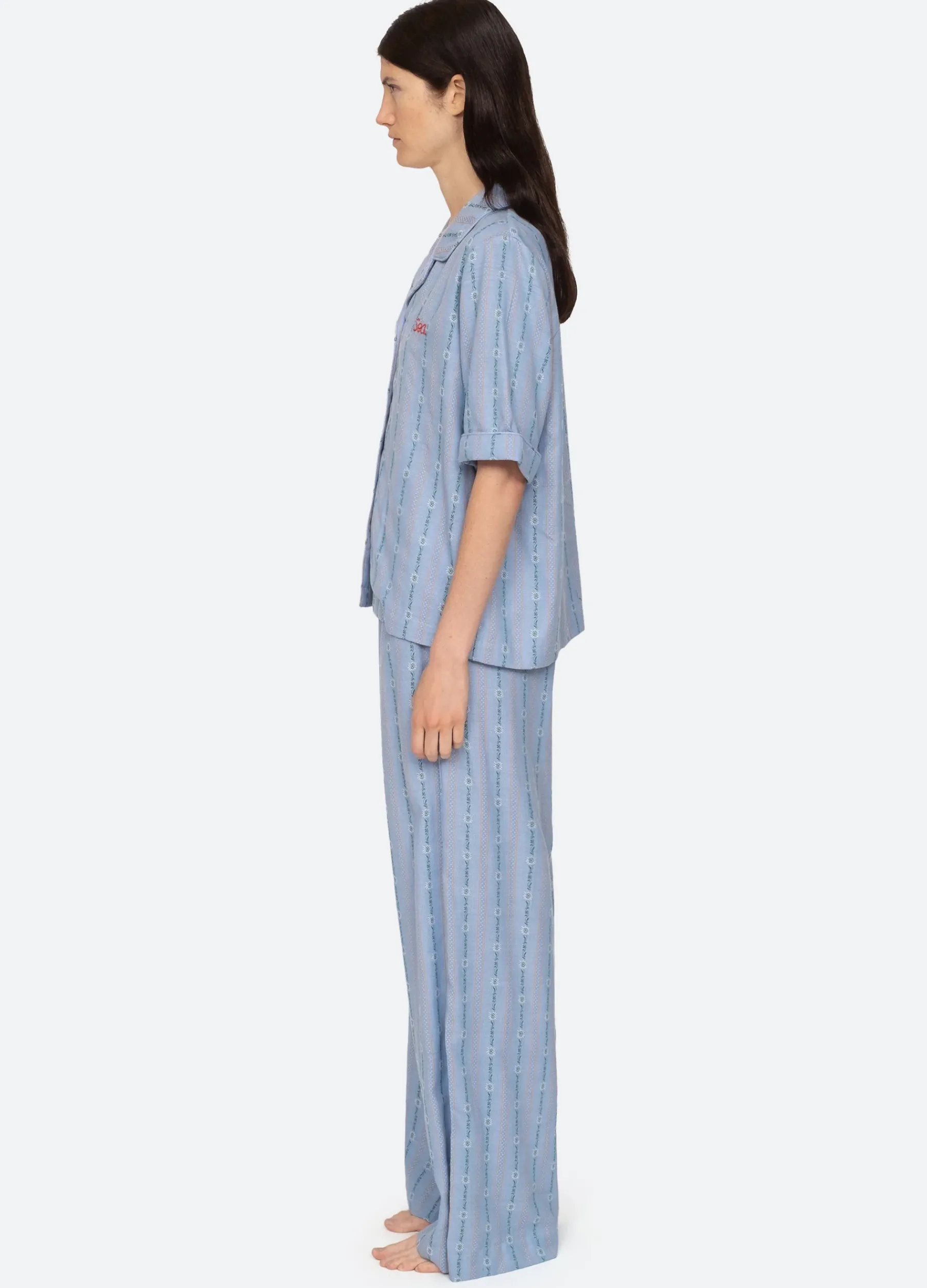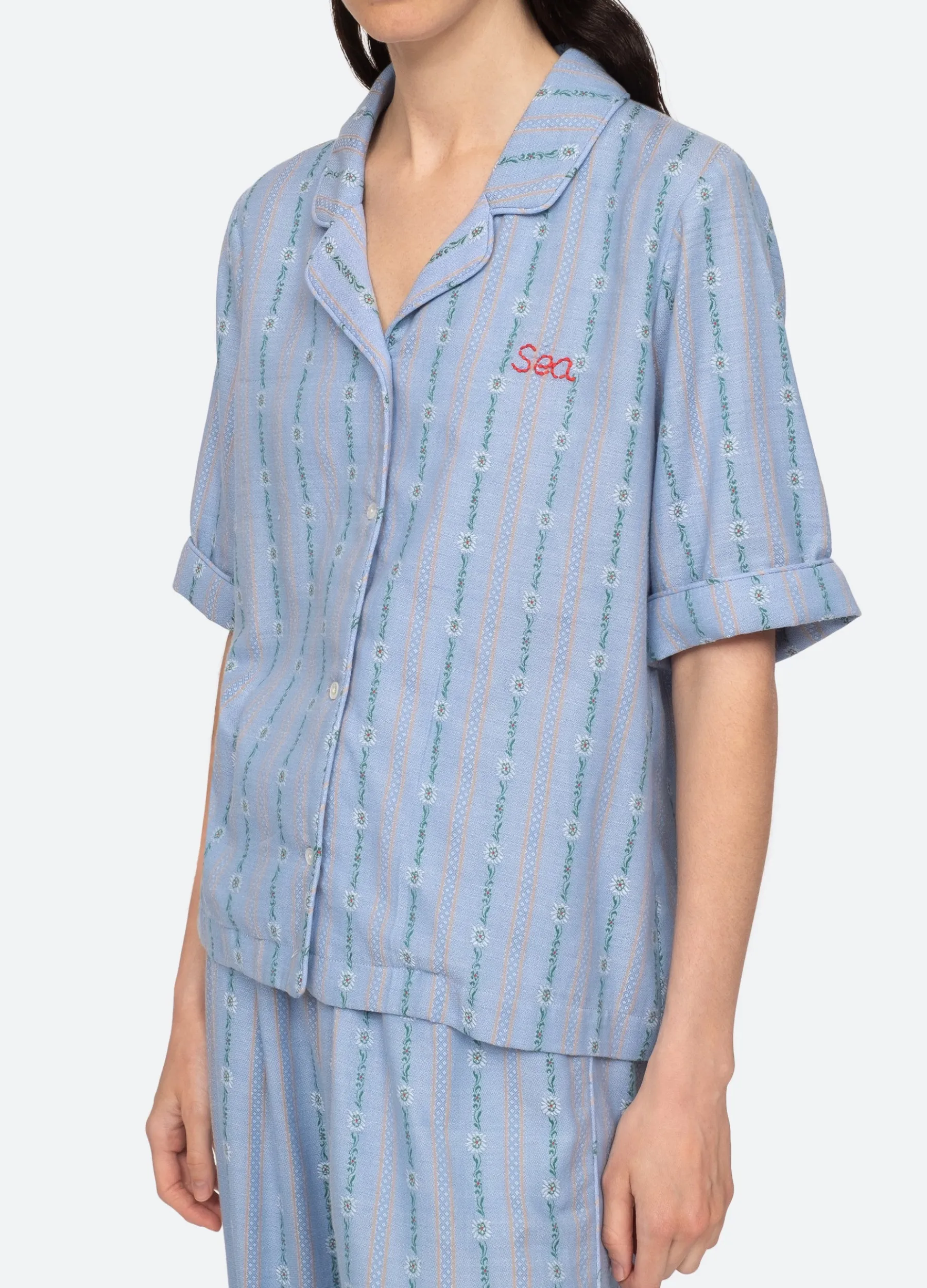 The Vellamo jacquard short sleeve pajama set features embroidered ‘SEA’ logo and piping detail.